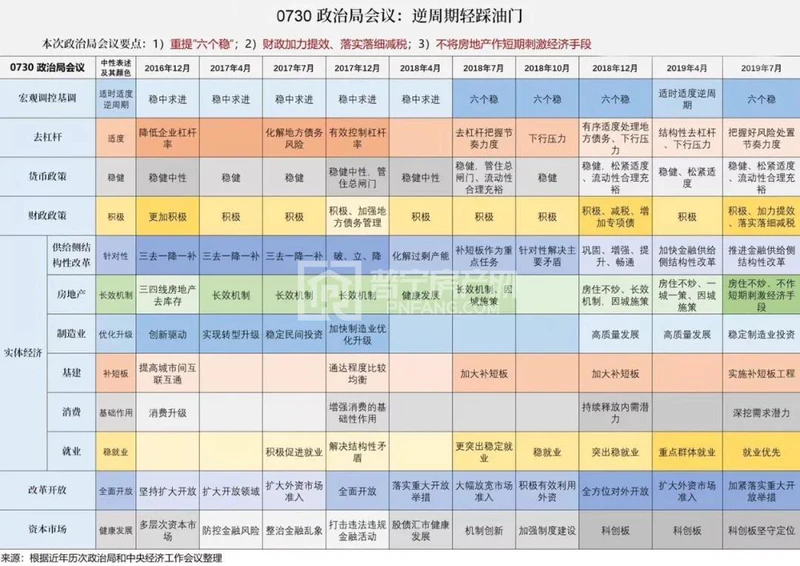 从2017年7月24日至2019年7月30日,以经济为主要议题的中央政治局会议已经召开了八次。除了2018年10月31日和2018年12月13日两次会议未提及房地产,其他六次会议都对房地产市场作出了重要表述。