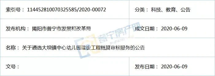 幼儿园建设是事关民生的大问题。加强镇中心幼儿园建设,是关注民生民情、实现教育公平、推进学前教育事业健康发展的必然要求。近日,为提高基础教育质量,推进乡镇场街道中心幼儿园建设步伐,创建推进教育现代化先进市,普宁市发展和改革局发布了《关于遴选大坝镇中心幼儿园建设工程概算审核服务的公告》,具体内容如下: