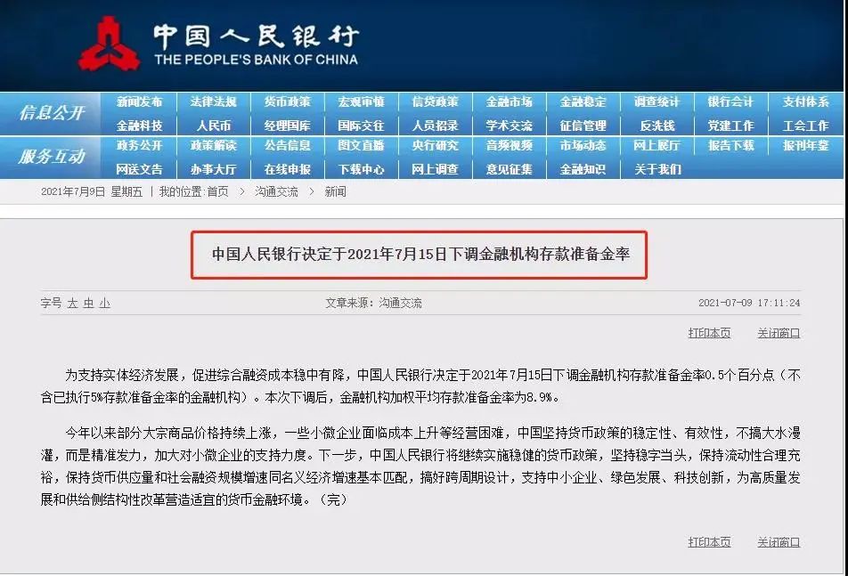 为支持实体经济发展,促进综合融资成本稳中有降,中国人民银行决定于2021年7月15日下调金融机构存款准备金率0.5个百分点(不含已执行5%存款准备金率的金融机构)。本次下调后,金融机构加权平均存款准备金率为8.9%。