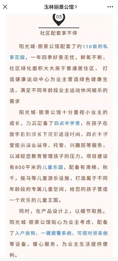 2019年6月12日,玉林丽景公馆微信公众号发文宣称,阳光城·丽景公馆配套了约110亩私享花园、四点半学堂、800平方米儿童乐园。该项目开发商是广西东鼎华光文化投资有限公司,为阳光城集团下属公司。同年10月31日,《玉林晚报》微信公众号也推送了相关广告。