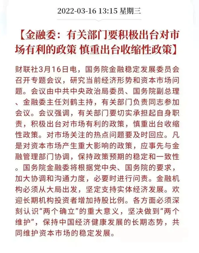 先是国家金融委专题会议定调:坚持以经济建设为中心,坚持深化改革、扩大开放……有关部门要切实承担起自身职责,积极出台对市场有利的政策,慎重出台收缩性政策。
