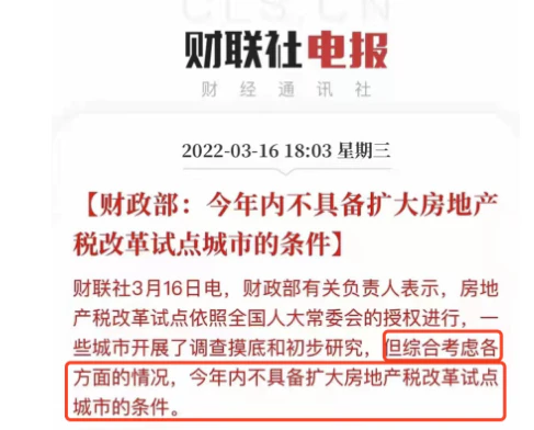 一是刚刚官宣的房地产税 ,官方表示不扩大今年房地产税改革试点条件.