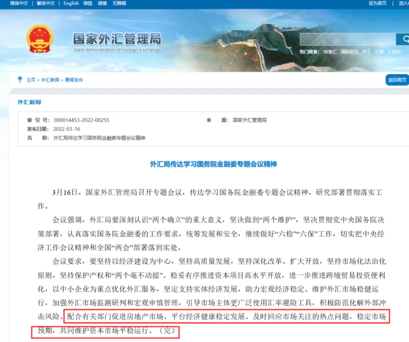 外汇局:配合有关部门促进房地产市场、平台经济健康稳定发展。及时回应市场关注的热点问题,稳定市场预期,共同维护资本市场平稳运行。