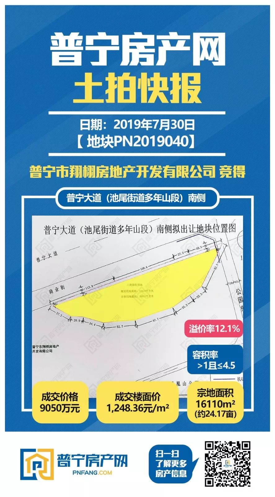 PN2019040地块只一轮流以9050万元被普宁市翔栩房地产开发有限公司拍下,楼面价1248.36元/m²,溢价率为12.1%。