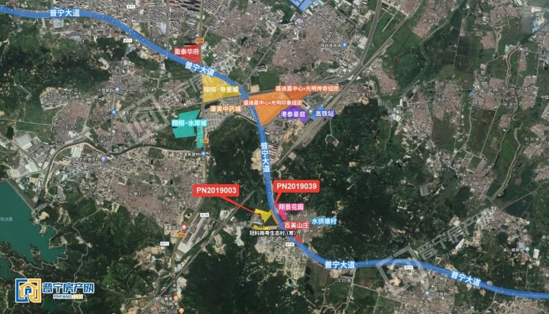 值得注意的是,今年3月28日,普宁市松雁实业投资有限公司曾以19100万元拍下位于下架山镇水供塘村(普宁大道南侧)地块(相关链接:57亩!1.91亿元成交!2019年普宁首宗宅地今成功出让!),与今天土拍竟得的PN2019039地块恰好紧密相连。