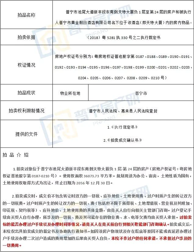 据了解,此次拍卖标的物包括被执行人普宁市天特投资有限公司名下位于普宁市池尾大道新丰段东南侧天特大厦负1层至第24层的房产和被执行人普宁市黄金假日酒店有限公司名下位于该酒店(即天特大厦)内的房内物品。