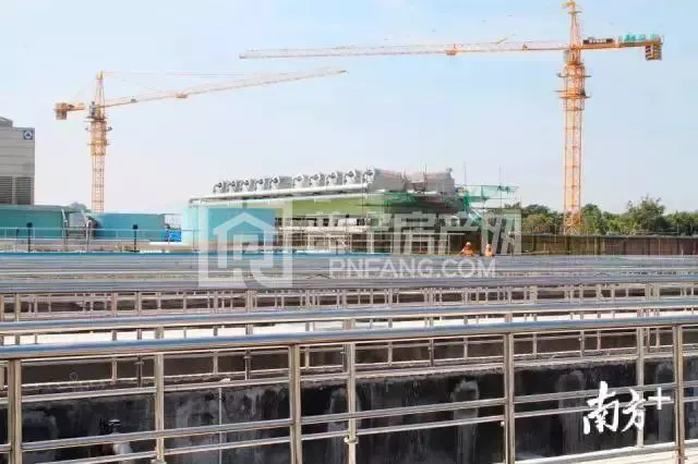 污水处理厂内,卡车进进出出,塔吊作业繁忙