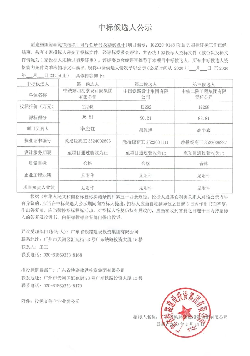 新建揭阳港疏港铁路项目可行性研究及勘察设计[项目编号:JG2020-0148]的招标评标工作已经结束,共有4家投标人递交了投标文件,经评标委员会评审,共否决1家投标人的投标文件(被否决投标文件情况为1家投标人未通过初步评审)。评标委员会经评审推荐了本项目中标候选人,所有中标候选人资格能力条件均响应招标文件要求。现将中标候选人情况予以公示(公示时间从2020-02-14 16:00 至 2020-02-17 23:59止),具体如下: