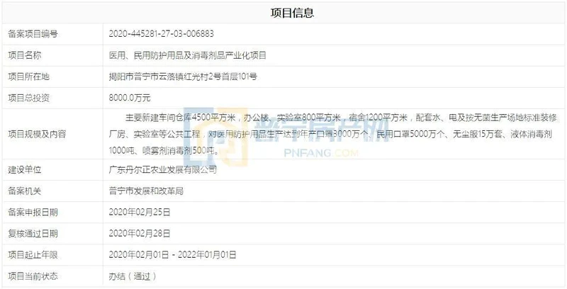 近日,小房君从普宁市发展和改革局了解到,广东丹尔正农业发展有限公司申请的医用、民用防护用品及消毒剂品产业化项目备案信息公示通过。