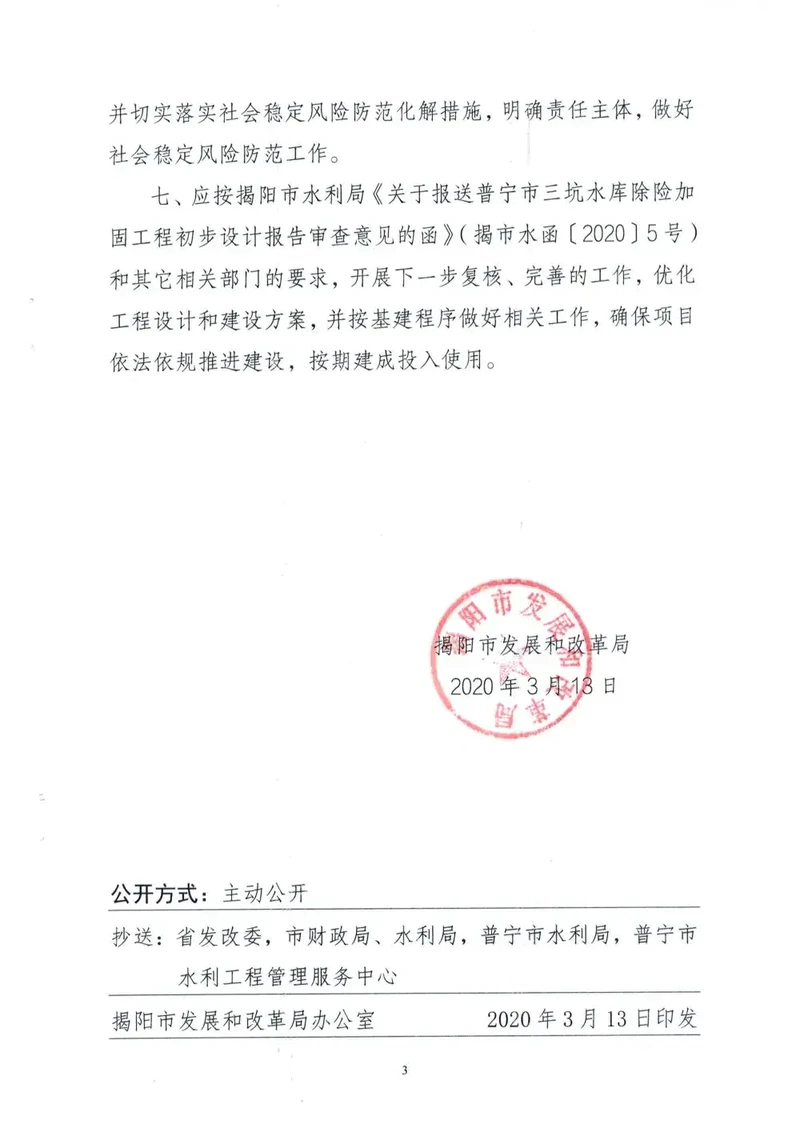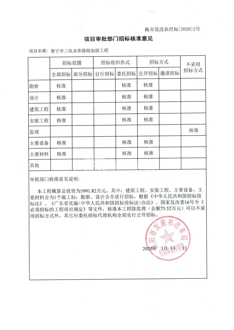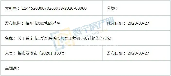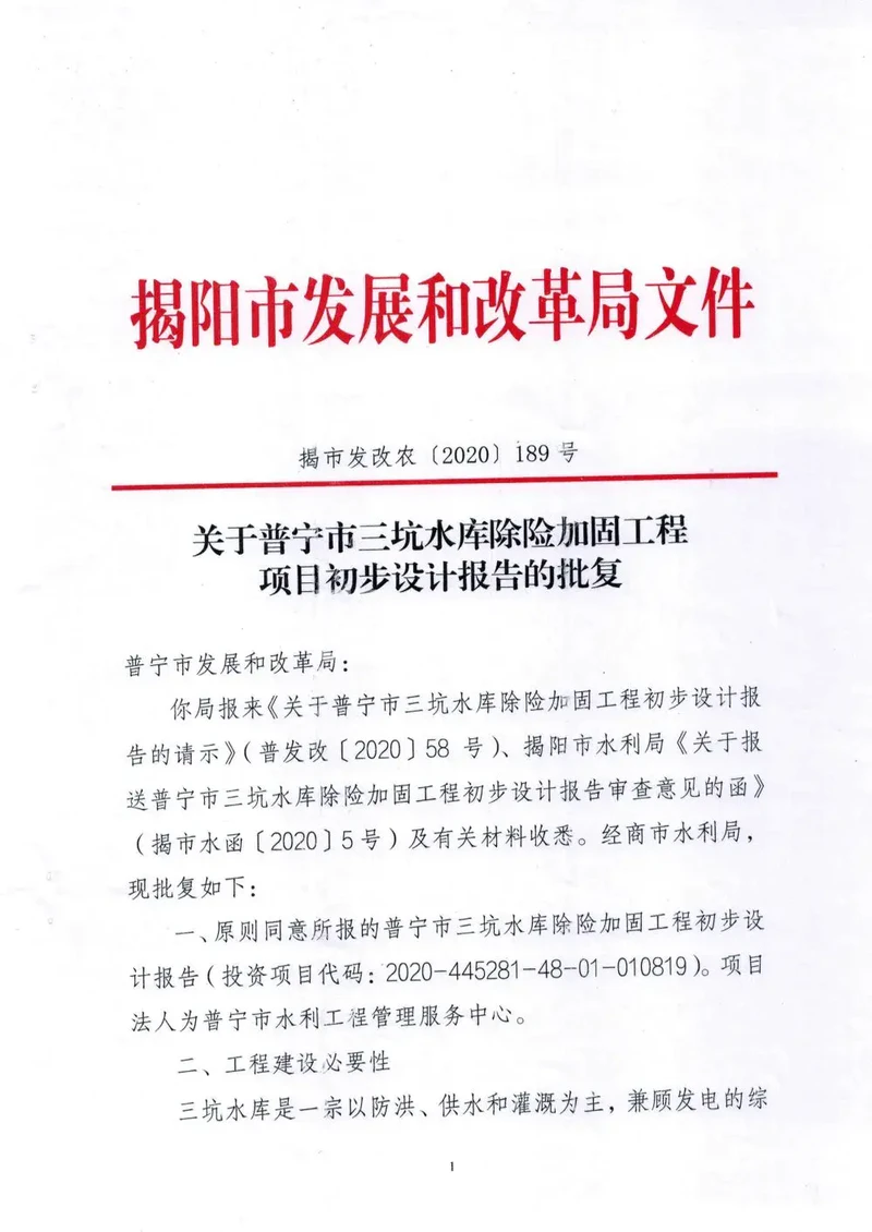 3月初,小房君曾报道过总投资3991.82万!普宁市三坑水库除险加固工程审批公示!近日,该工程迎来新进展,揭阳市发展和改革局发布了关于普宁市三坑水库除险加固工程初步设计报告的批复,原则同意所报的普宁市三坑水库除险加固工程初步设计报告(投资项目代码:2020-445281-48-01-010819)项目,法人为普宁市水利工程管理服务中心。