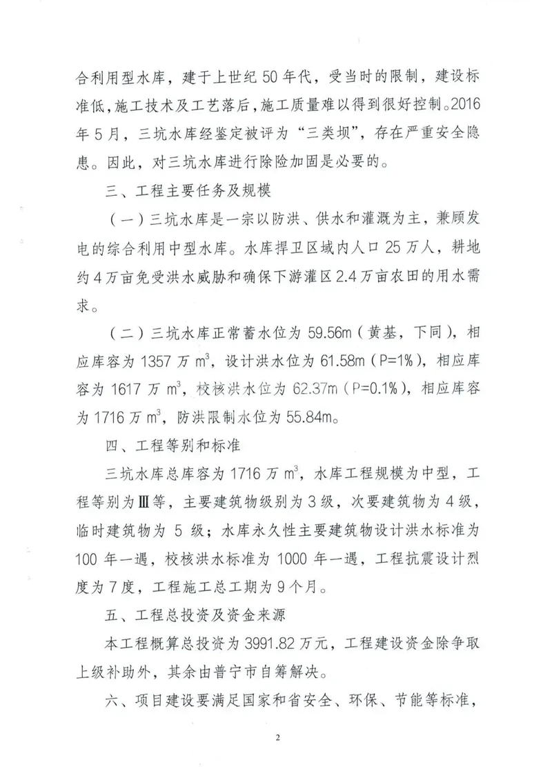 据了解,三坑水库是一宗以防洪、供水和灌溉为主,兼顾发电的综合利用型水库,建于上世纪50年代,受当时的限制,建设标准低,施工技术及工艺落后,施工质量难以得到很好控制。2016年5月,三坑水库经鉴定被评为“三类坝”, 存在严重安全隐患。因此,对三坑水库进行除险加固是必要的。(一)三坑水库是一宗以防洪、供水和灌溉为主,兼顾发电的综合利用中型水库。水库捍卫区域内人口25万人,耕地约4万亩免受洪水威胁和确保下游灌区2. 4万亩农田的用水需求。(二)三坑水库正常蓄水位为 59. 56m(黄基,下同), 相应库容为1357万㎡, 设计洪水位为61. 58m(P=1%), 相应库容为1617万㎡, 校核洪水位为62. 37m(P=0. 1%), 相应库容为1716万㎡, 防洪限制水位为55. 84m。三坑水库总库容为1716万㎡, 水库工程规模为中型,工程等别为III等,主要建筑物级别为3级,次要建筑物为4级,临时建筑物为5级;水库永久性主要建筑物设计洪水标准为100年一遇,校核洪水标准为 1000年一遇,工程抗震设计烈度为7度,工程施工总工期为9个月。本工程概算总投资为3991. 82万元,工程建设资金除争取上级补助外,其余由普宁市自筹解决。