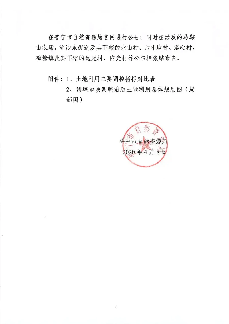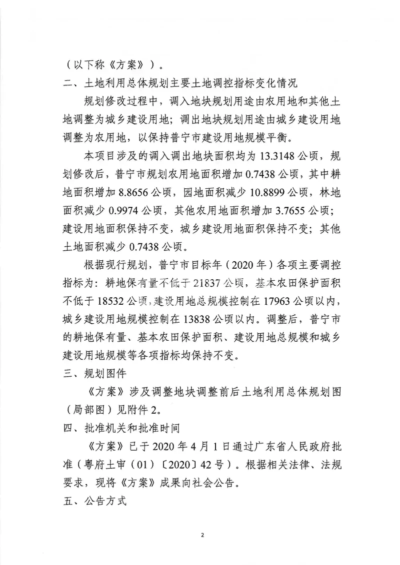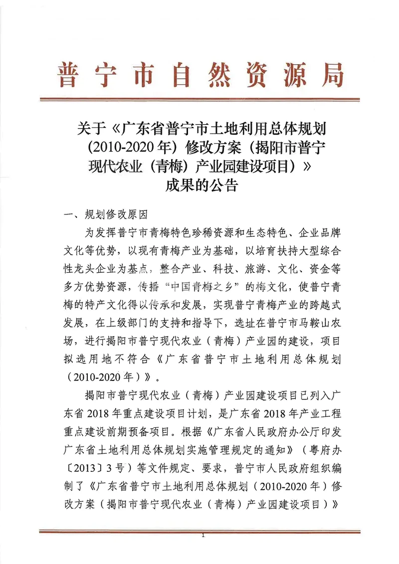 今天,普宁市自然资源局发布了关于《广东省普宁市土地利用总体规划(2010-2020年)修改方案(揭阳市普宁现代农业(青梅)产业园建设项目)》成果的公告。《方案》已于2020年4月1日通过广东省人民政府批准(粤府土审(01)[2020]42号)。根据相关法律、法规要求,现将《方案》成果向社会公告。