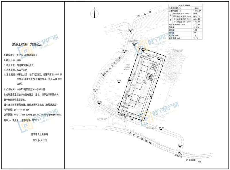 普宁市玉龙泉温泉山庄酒店建设项目计划总投资约5400万元人民币,总用地面积为2700㎡,建设面积14726.57㎡,其中计容建筑面积5980.54㎡,不计容部分建设面积为8746.03㎡(包括地下室建筑面积7344㎡,架空层建筑面积1402.03㎡)。拟建1栋集住宿和餐饮于一体的休闲娱乐酒店,施工总工期预计约24个月。