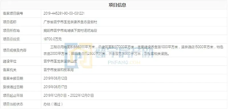 据相关网站公示,普宁市玉龙泉温泉山庄将建设普宁市玉龙泉康养生态度假村,主要建设养生馆、温泉酒店、特色农庄、田园生态园、养老服务及配套相关设施。目前该项目已备案申报通过,而玉龙泉温泉山庄酒店将成为该项目的首期建设项目。