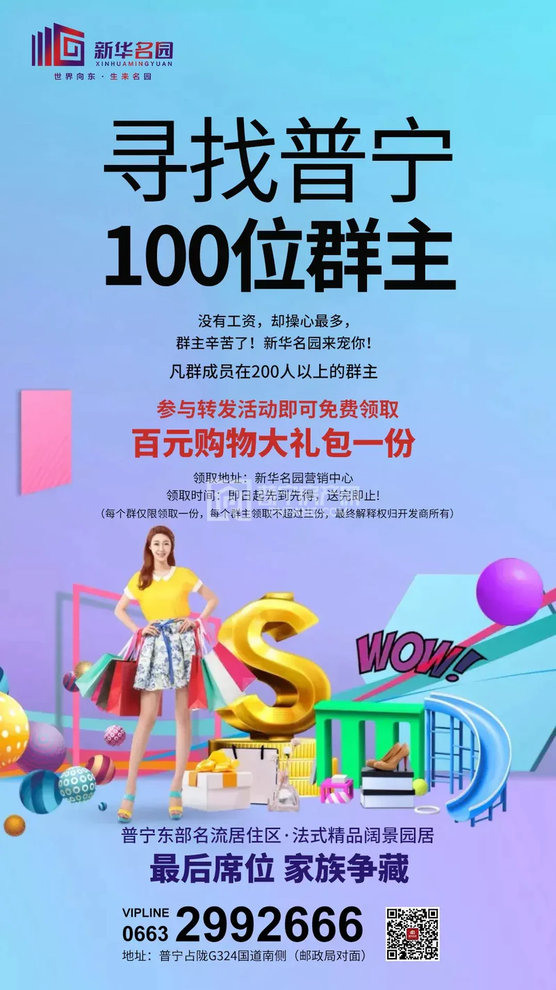 嗯嗯,我们先一起了解一下这次#寻找全城100名群主#的活动,转发领取购物大礼包的同时,把钜惠的购房消息安利给身边亲友吧!