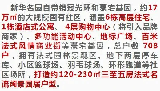 声明:“新华名园”为本案推广名,本条微信内容为售楼宣传资料,相关内容不排除因政府相关规划、规定及开发商未能控制的原因而发生变化,文中所用图片、文字、视频、数据、位置示意、周边环境、交通、教育、商业及其他配套设施的介绍等仅作为参考之用,并非最终方案,不作为要约或承诺。涉及的户型所标尺寸和面积仅供参考,不作为交房标准,实际交付以政府最后批准之法律文件及买卖双方签订的《商品房买卖合同》为准。部分图片来源于网络,如涉及侵权请予以告知。