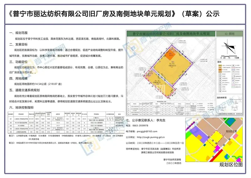 近日,小房君从普宁市自然资源局了解到,普宁市丽达纺织有限公司旧厂房及南侧地块单元规划原于2019年9月至10月已在相关场所公示,因规划方案进一步优化,现予以重新公示。具体内容如下: