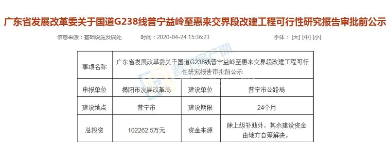 在揭阳市人民政府办公室发布的《2020年市政府主要工作任务分工方案》中曾提到,将开工建设国道G238普宁益岭至惠来惠城段、省道S237普宁赤岗至麒麟段等13个国省道改建(改造)项目。近日,该工程有了最新进展,广东省发展改革委发布了国道G238线普宁益岭至惠来交界段改建工程可行性研究报告审批前公示,具体内容如下: