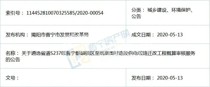 为完善道路配套设施,实现四通八达的道路交通网络,近日,普宁市发展和改革局发布了关于遴选省道S237线普宁麒麟镇区至姚厝围村路段供电线路迁改工程概算审核服务的公告。