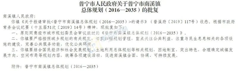 近日,普宁市人民政府发布普府函〔2019〕612号决定,原则同意南溪镇人民政府提出的《关于报请审批<普宁市南溪镇总体规划(2016—2035)>的请示》。本规划期限为2016-2035年。具体内容如下: