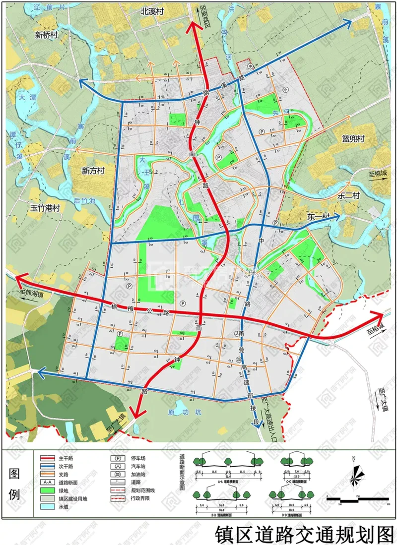 镇主干道:镇区的主干道规划道路红线宽32m(具体要求按控制性规划执行),用于连接主要对外交通和组织镇区内部交通。