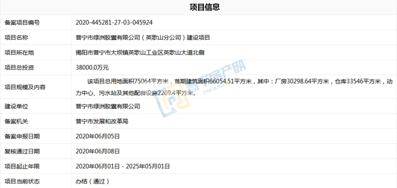 近日,总投资3.8亿的普宁市绿洲胶囊有限公司(英歌山分公司)建设项目备案通过,具体内容如下: