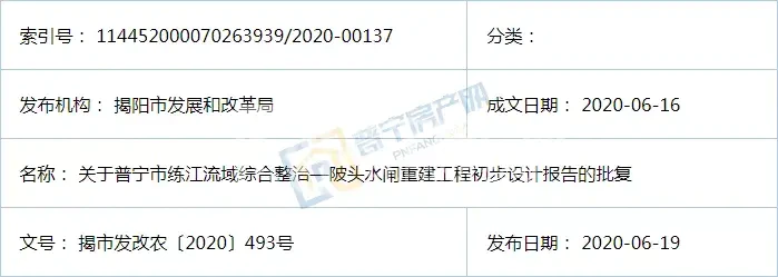 近日,揭阳市发展和改革局发布了关于普宁市练江流域综合整治—陂头水闸重建工程初步设计报告的批复,基本同意所报的普宁市练江流域综合整治—陂头水闸重建工程初步设计报告(投资项目代码:2020-445281-48-01-022929)。项目法人为普宁市水利工程管理服务中心。具体内容如下: