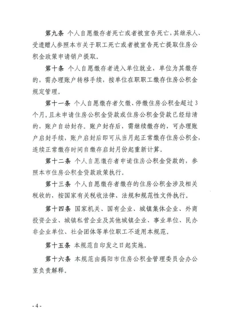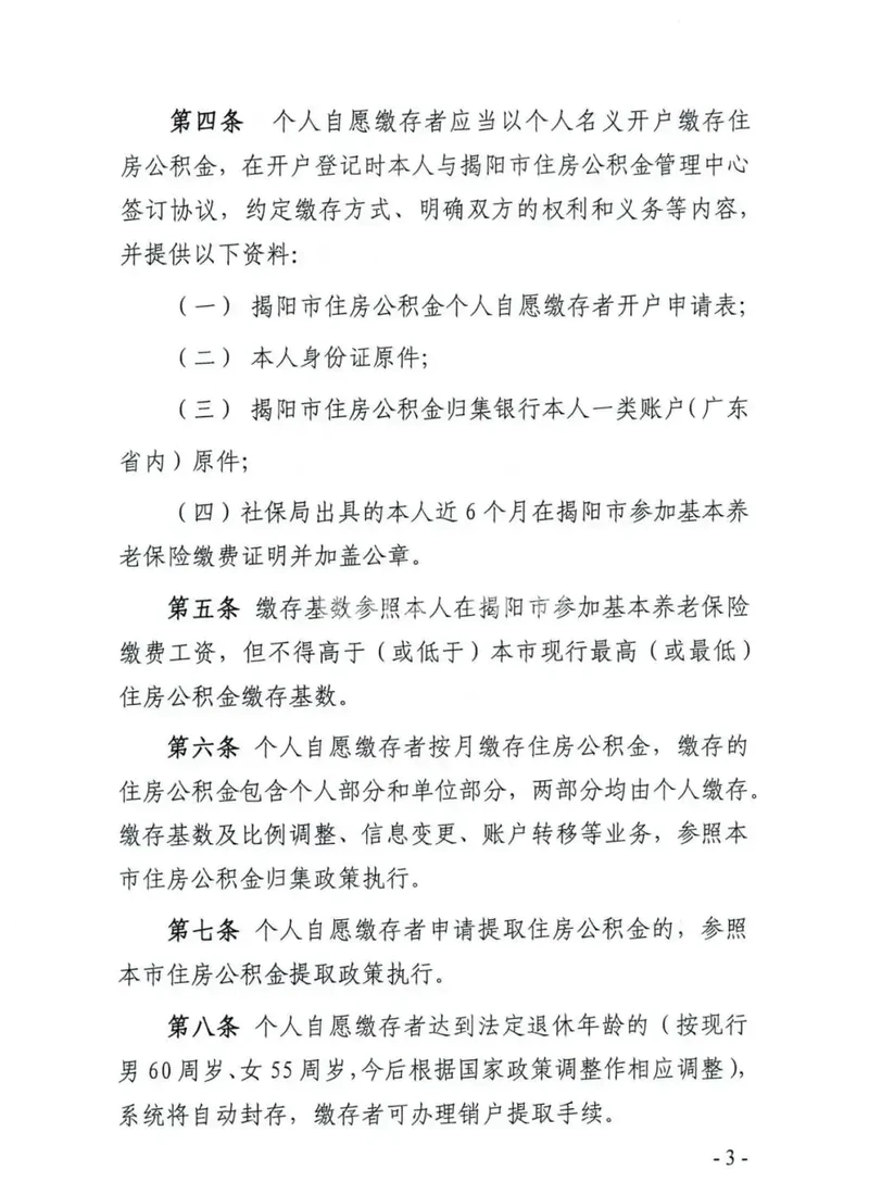 划重点文件提到,本规范所称自愿缴存使用住房公积金的对象为:年满18周岁且未达法定退休年龄,具有完全民事行为能力,自愿遵守住房公积金管理条例规定,目前在本市及其他地市未设立住房公积金账户并在揭阳市参加基本养老保险累计6个月(含)以上的下列人员(简称个人自愿缴存者):(一)农业转移人口;(二)自由职业者;(三)个体工商户及其他灵活就业人员。个人自愿缴存者需提供以下资料:(一)揭阳市住房公积金个人自愿缴存者开户申请表;(二)本人身份证原件;(三)揭阳市住房公积金归集银行本人一类账户(广东省内)原件;(四)社保局出具的本人近6个月在揭阳市参加基本养老保险缴费证明并加盖公章。