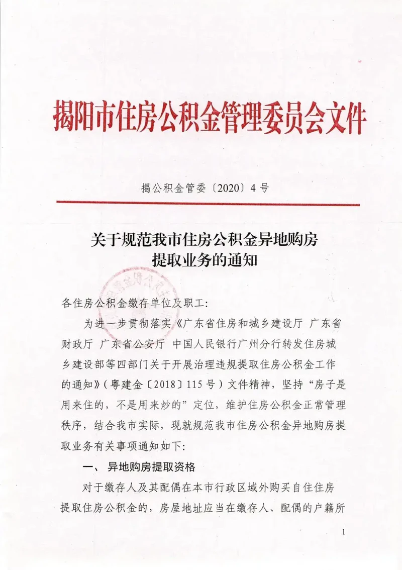 为进一步贯彻落实《广东省住房和城乡建设厅 广东省财政厅 广东省公安厅 中国人民银行广州分行转发住房城乡建设部等四部门关于开展治理违规提取住房公积金作的通知》(粤建金〔2018〕115号)文件精神,坚持“房子是用来住的,不是用来炒的”定位,维护住房公积金正常管理秩序,结合我市实际,现就规范我市住房公积金异地购房提取业务有关事项通知如下:对于缴存人及其配偶在本市行政区域外购买自住住房提取住房公积金的,房屋地址应当在缴存人、配偶的户籍所在地或工作所在地,才能依照有关程序办理住房公积金购房提取。除我市行政区域内购房提取需提供的资料外,在缴存人、配偶的户籍所在地购房的,需提供身份证、户口本;在缴存人、配偶的工作所在地购房的,需提供工作所在地社保局出具的参加基本养老保险证明等相关证明材料。