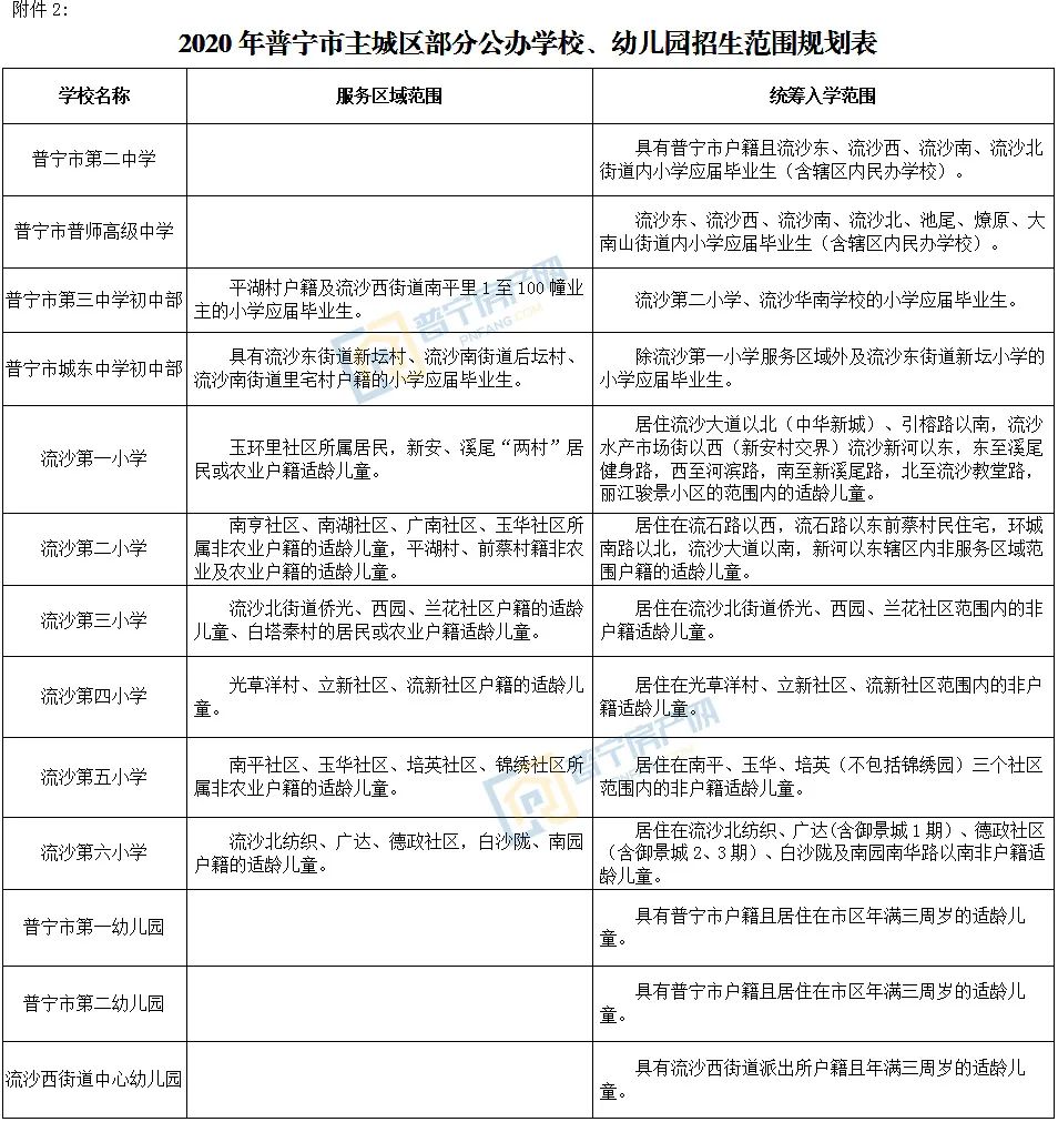 据今日普宁市教育局制订的《2020年普宁市主城区部分公办学校、幼儿园招生工作方案》,今年公办学校严格执行就近入学的原则,全面推行零择校,采取分类分批、条块结合的办法,划分为服务区域内学生和统筹学生入学进行招生。(详情可点击查看链接:2020年普宁市主城区部分公办学校、幼儿园招生工作方案) 招生范围 普宁市第二中学、普宁市普师高级中学、普宁市第三中学、普宁市城东中学、普宁陈宝文学校的初中部一年级新生,普宁市流沙第一至第六小学及普宁市第一幼儿园、普宁市第二幼儿园、普宁市流沙西街道中心幼儿园的新生。 招生对象 (一)幼儿园 年满三周岁(即2017年8月31日前及此日出生)居住在市区普宁户籍未入园的适龄儿童。 (二)小学一年级 年满六周岁(即2014年8月31日前及此日出生)未入学的适龄儿童,且符合以下条件之一: 1.具有主城区招生改革学校服务范围户籍; 2.非服务范围户籍但享受政策性照顾人员的子女; 3.符合条件的进城居住、务工人员随迁子女。 (三)初中一年级 在流沙东、流沙西、流沙南、流沙北四个街道所属学校就读的普宁市户籍小学应届毕业生(含四个街道内的民办学校),可报读普宁市第二中学初中部。 在流沙东、流沙西、流沙南、流沙北、池尾(楼盘详情户型图相册地图)、燎原、大南山(楼盘详情户型图相册地图)七个街道所属学校就读的小学应届毕业生(含七个街道内的民办学校),可报读普宁市普师高级中学初中部。 平湖村户籍及流沙西街道南平里1至100幢业主的小学应届毕业生及流沙第二小学、流沙华南学校的小学应届毕业生,可报读普宁市第三中学初中部(具体见附件2)。 流沙东街道新坛村户籍、流沙南街道后坛(楼盘详情户型图相册地图)村户籍、流沙南街道里宅(楼盘详情户型图相册地图)村户籍及流沙第一小学、流沙东街道新坛小学统筹范围内的小学毕业生,可报读普宁市城东中学初中部(具体见附件2)。 陈宝文学校初中一年级新生只招收其本校小学毕业生及流沙东街道玉环里社区、大林社区(楼盘详情户型图相册地图)、新美社区所属居民,新安、溪尾“两村”居民或农业户籍的小学毕业生。陈宝文学校初中一年级新生报名工作暂不列入招生平台管理,由招生学校按招生范围严格审核招录,并将招生名册报市教育局学籍管理部门备案。 所有招生对象的户籍截至2020年5月31日。 今年的公立学校报读如此火爆,对普宁楼市产生了另外一个关键词——“学区房”的概念。众所周知,学区房这个代表性的楼盘就是星河明珠湾。 今年9月普宁华师附学校即将迎来首批学生开学,小编也将持续关注。想了解更多详情,欢迎添加小房君微信,或底部留言与小编互动!