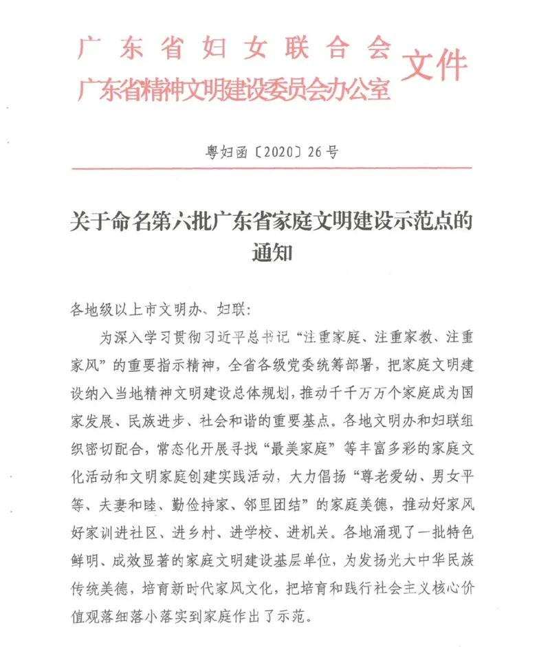 荣获第六批广东省家庭文明建设示范点称号
