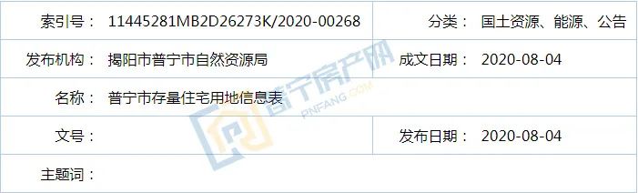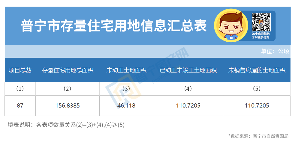 据悉,普宁市存量住宅用地项目总数87宗,总面积156.8385公顷(2352.5775亩)。其中,未动工土地面积46.118公顷(691.77亩),已动工未竣工土地面积110.7205公顷(1660.8075亩)。未销售房屋的土地面积110.7205公顷。