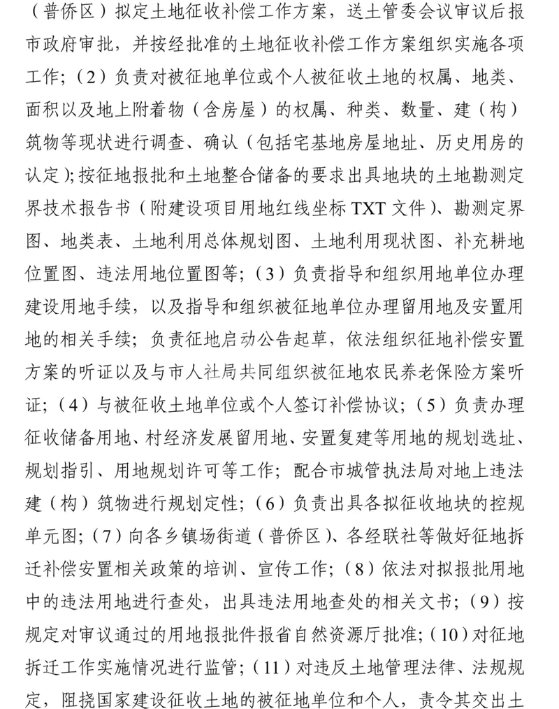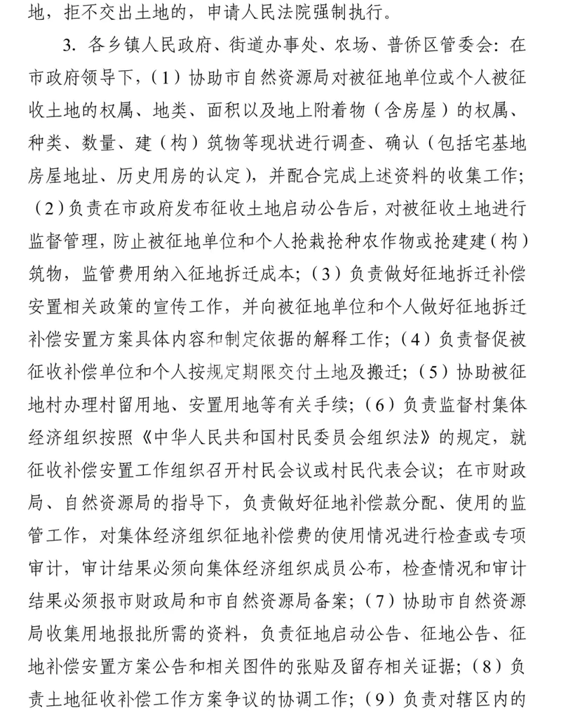 (十)各乡镇场街道、普侨区负责所在地土地征收具体工作,协助办理补偿登记,监督被征地村依法召开村民代表会议或村民会议。做好村集体征地补偿款分配使用的监管,负责青苗及附着物清理。协助做好已征收土地的交地工作。