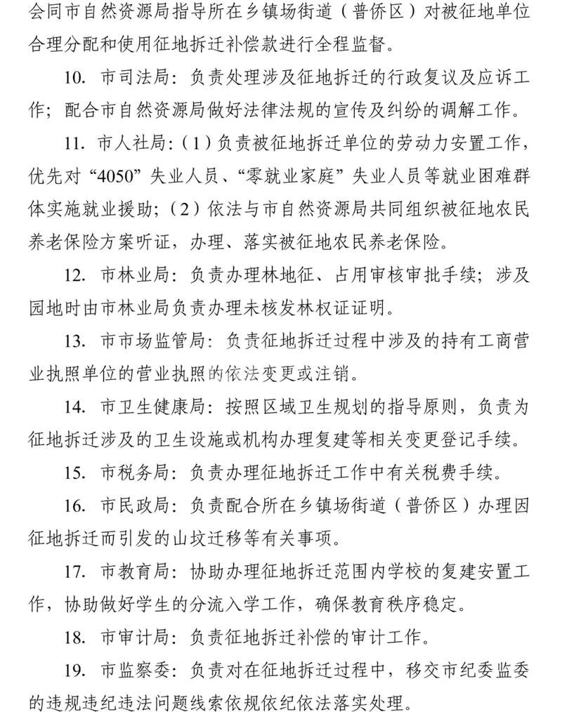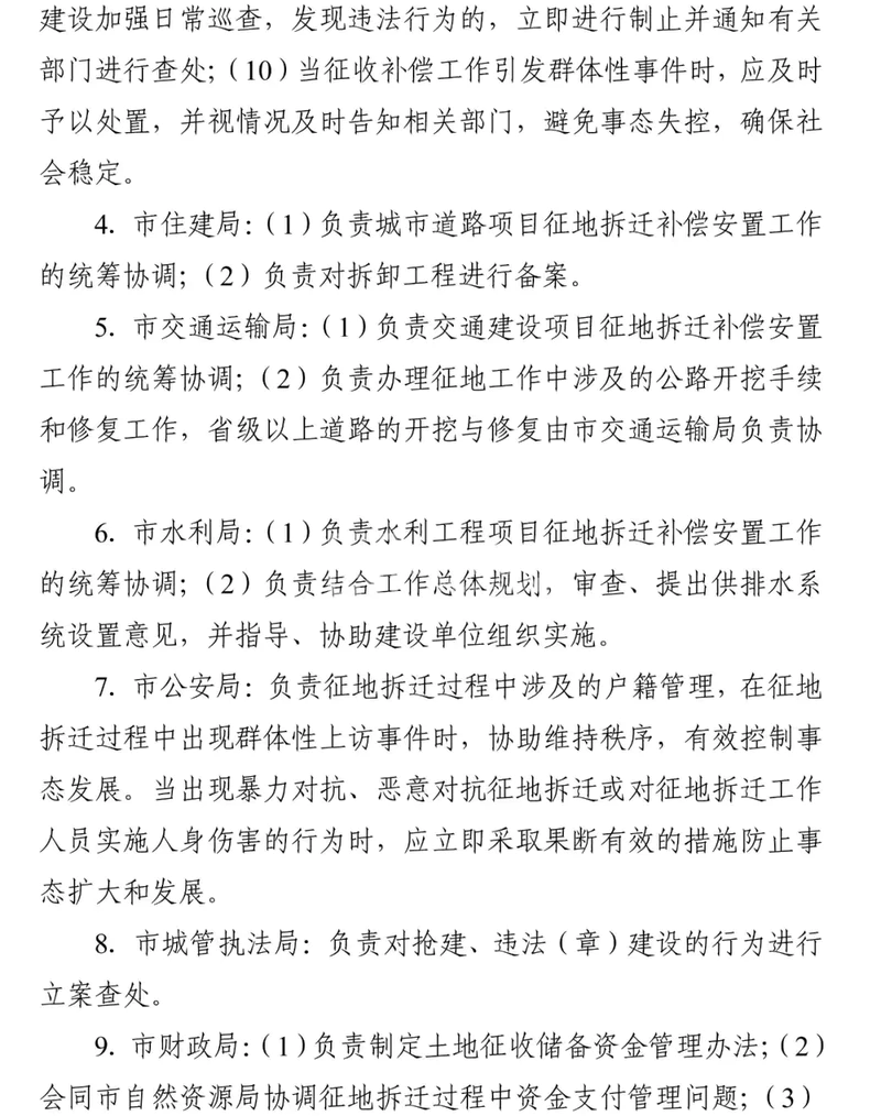 (九)市政府为征收土地实施责任主体,负责统一组织实施土地征收工作,发布征地启动公告、补偿安置公告、征收土地公告,审批土地储备规划、储备计划、土地利用总体规划编制与调整、土地征收补偿工作方案、土地供应方案。