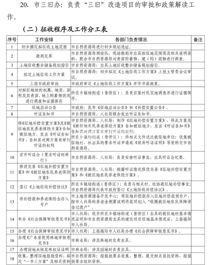 (十一)市发改局、工信局、财政局、人社局、住建局、林业局、揭阳市生态环境局普宁分局等部门按照各自职能,做好土地征收储备供应有关工作。