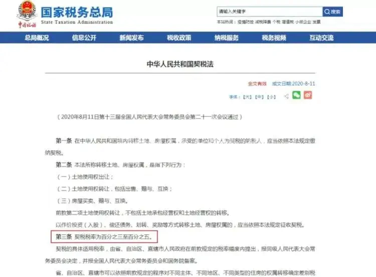 据1997年发布的《中华人民共和国契税暂行条例》显示,第三条契税税率为3-5%,和最新的《契税法》并无差别。