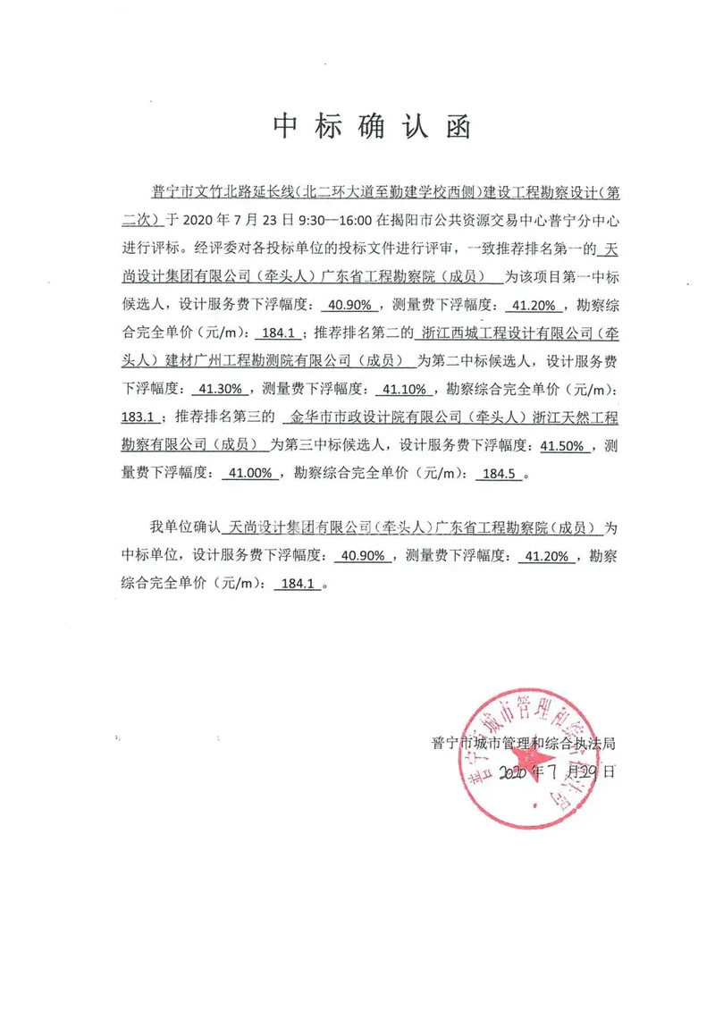 近日,小房君从揭阳市公共资源交易中心了解到,备受关注的普宁市文竹北路延长线(北二环大道至勤建学校西侧)建设工程勘察设计中标结果公告,确认天尚设计集团有限公司(牵头人)广东省工程勘察院(成员)为中标单位。