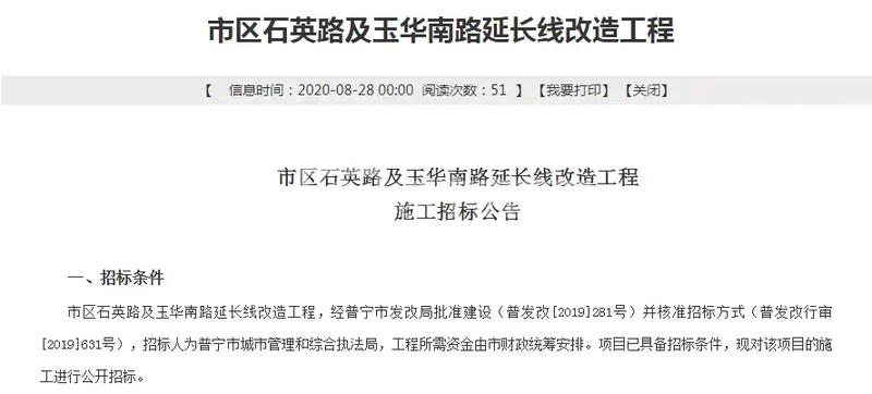 今天,小房君从揭阳市公共资源交易中心了解到,市区石英路及玉华南路延长线改造工程,经普宁市发改局批准建设(普发改[2019]281号)并核准招标方式(普发改行审[2019]631号),招标人为普宁市城市管理和综合执法局,工程所需资金由市财政统筹安排。项目已具备招标条件,现对该项目的施工进行公开招标。