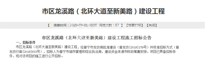 今天,小房君从揭阳市公共资源交易中心了解到,市区龙溪路(北环大道至新美路)建设工程,经普宁市发改局批准建设(普发改[2019]279号)并核准招标方式(普发改行审[2019]633号),招标人为普宁市城市管理和综合执法局,建设资金来源市财政筹集安排。项目已具备招标条件,现对该项目的施工进行公开招标。