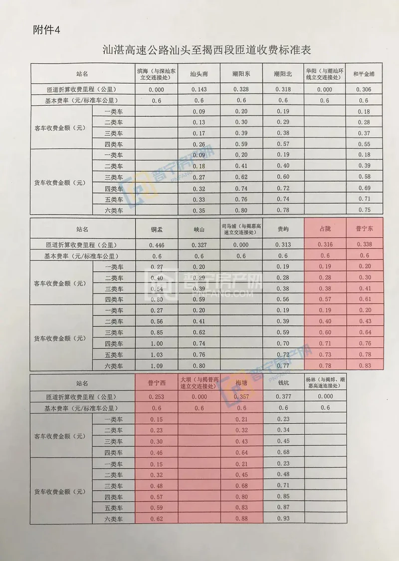 而梅塘匝道收费站拟建于普宁市梅塘镇内丰村,该村也计划利用汕湛高速出入口在村中的契机,大力发展食品加工业、塑料加工业、产品包装业。 占陇匝道收费站 占陇匝道收费站将于2020年9月建成通车。临近普宁市纺织印染环保综合处理中心,该中心是省重点项目和省十大民生实事之一,按照“产业集聚、企业集中、统一治理、土地集约”的原则规划建设。 就在近日,省人民政府发布了《关于汕湛高速公路汕头至揭西段车辆通行费收费标准有关问题的批复》,同意汕湛高速公路汕头至揭西段交工验收通车和收费设施经验收符合联网收费技术要求后开始收费,收费车型执行《收费公路车辆通行费车型分类》(JT/T489-2019),收费费率为0.6元/标准车公里,1至4类客车的收费系数分别为1、1.5、2、3,1至6类货车的收费系数分别为1、2.1、3.16、3.75、3.86、4.09,专项作业车的收费标准参照货车执行。 收费标准如下▼ 据了解,汕湛高速公路全长86.6公里,其中普宁段全长29.57公里。据广东省人民政府发布的《关于汕湛高速公路汕头至揭西段设置收费站问题的批复》,普宁将新增4个匝道收费站,分别是占陇、普宁东、普宁西、梅塘。 在2020年政府工作报告曾提到,立足揭阳市“三中心一示范区”大格局,不断提升对外联通能力。大力对接揭阳疏港铁路、揭惠城际轨道规划建设,全力服务汕湛高速、揭惠高速建设,优化高速出入口连接线。 汕湛高速公路普宁段建成后,将与厦深铁路和揭普惠、潮惠、揭惠高速公路构成普宁市区域内现代化综合交通网络主骨架。届时,普宁到汕头不用半个小时,到广州也能缩短1个多小时,使普宁融入粤东1小时经济圈,实现面向珠三角和厦漳泉两个经济区的快速互联互通,带动普宁经济社会发展。