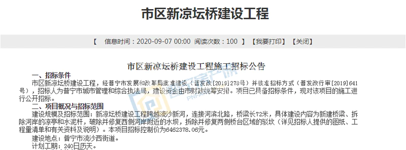 近日,小房君从揭阳市公共资源交易中心了解到,普宁市区新凉坛桥建设工程,经普宁市发展和改革局批准建设(普发改[2019]278号)并核准招标方式(普发改行审[2019]641号),招标人为普宁市城市管理和综合执法局,建设资金由市财政统筹安排。项目已具备招标条件,现对该项目的施工进行公开招标。