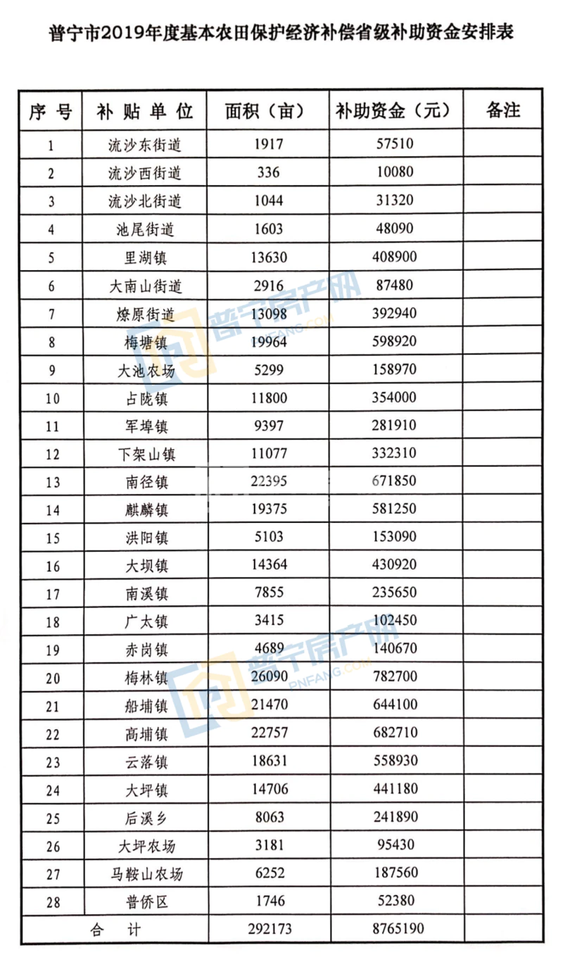 近日,据小房君了解,普宁市2019年度基本农田保护经济补偿省级补助资金已下达,共28个补贴单位292173亩农田获补助资金8765190元。此项资金主要分配到承担基本农田保护的农村集体经济组织、国有农场等集体土地所有权单位和国有农用地使用权单位。实行基本农田保护责任与保护补贴相挂钩的原则,补助资金主要用于基本农田后续管护、农村土地整治等支出。