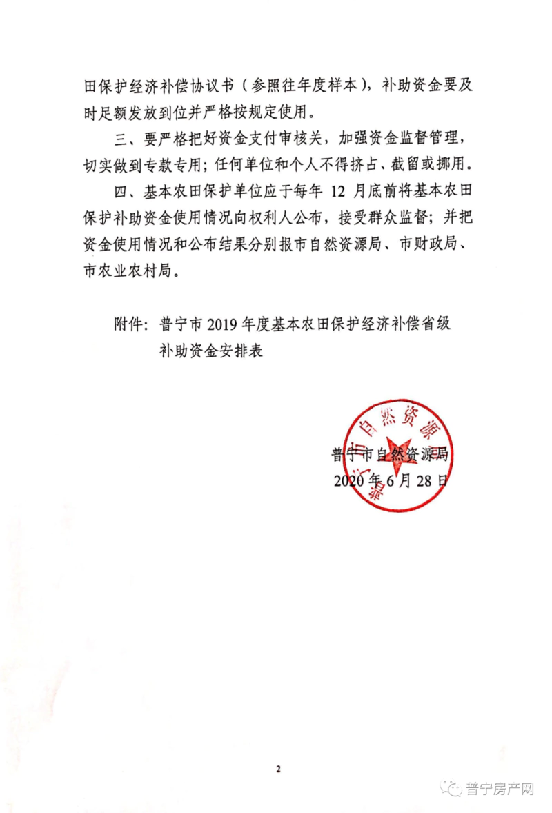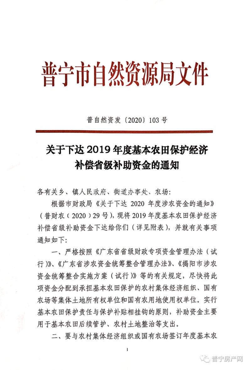 关于下达2019年度基本农田保护经济 补偿省级补助资金的通知 各有关乡、镇人民政府、街道办事处、农场: 根据市财政局《关于下达2020年度涉农资金的通知》(普财农(2020) 29号), 现将2019年度基本农田保护经济补偿省级补助资金下达给你们(详见附表), 并就有关事项通知如下: 一、严格按照《广东省省级财政专项资金管理办法(试行)》、《广东省涉农资金统筹整合管理办法》、《揭阳市涉农资金统筹整合实施方案(试行)》等的有关规定,尽快将此项资金分配到承担基本农田保护的农村集体经济组织、国有农场等集体土地所有权单位和国有农用地使用权单位。实行基本农田保护责任与保护补贴相挂钩的原则,补助资金主要用于基本农田后续管护、农村土地整治等支出。 二、要与农村集体经济组织或国有农场签订年度基本农田保护经济补偿协议书(参照往年度样本), 补助资金要及时足额发放到位并严格按规定使用。 三、要严格把好资金支付审核关,加强资金监督管理,切实做到专款专用;任何单位和个人不得挤占、截留或挪用。 四、基本农田保护单位应于每年12月底前将基本农田保护补助资金使用情况向权利人公布,接受群众监督;并把资金使用情况和公布结果分别报市自然资源局、市财政局、市农业农村局。 附件:普宁市2019年度基本农田保护经济补偿省级补助资金安排表 普宁市自然资源局 2020年6月28日 原文件: