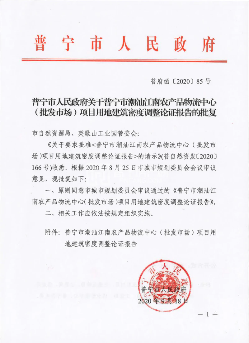 近日,由广州博厦建筑设计研究院有限公司编制的《普宁市潮汕江南农产品物流中心(批发市场)项目用地建筑密度调整论证报告》已于2020年09月完成,并于2020年09月获得普宁市人民政府批复(普府函[2020] 85号)。根据《广东省城乡规划条例》的规定,现进行批后公示。