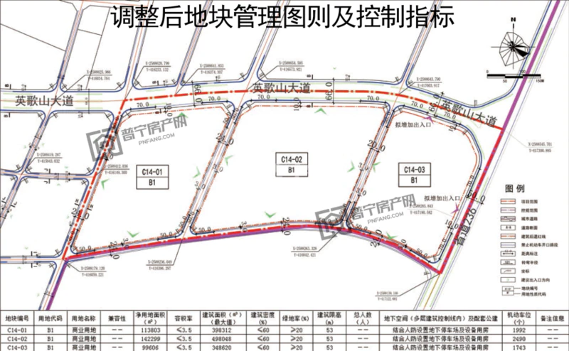 C14-03地块交通优化调整:增加2个机动车出入口(地块北侧增设货车出入口,地块东侧的小汽车出入口)。