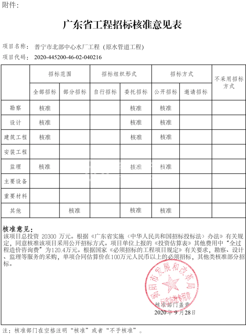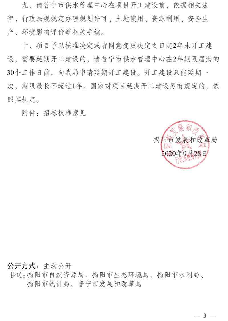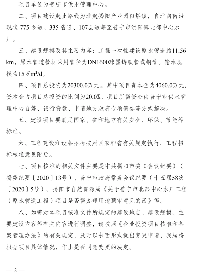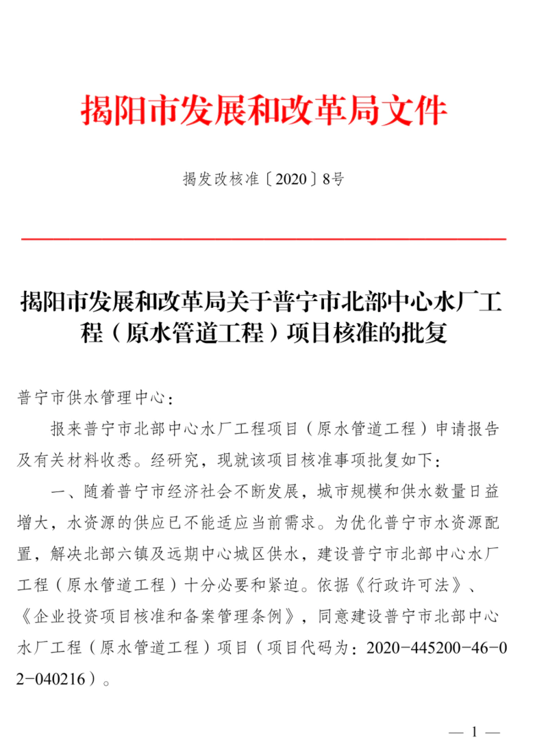 随着普宁市经济社会不断发展,城市规模和供水数量日益增大,水资源的供应已不能适应当前需求。为优化普宁市水资源配置,解决北部六镇及远期中心城区供水,建设普宁市北部中心水厂工程(原水管道工程)十分必要和紧迫。依据《行政许可法》、《企业投资项目核准和备案管理条例》, 揭阳市发展和改革局同意建设普宁市北部中心水厂工程(原水管道工程)项目(项目代码为:2020-445200-46-02-040216) 。项目单位为普宁市供水管理中心。
