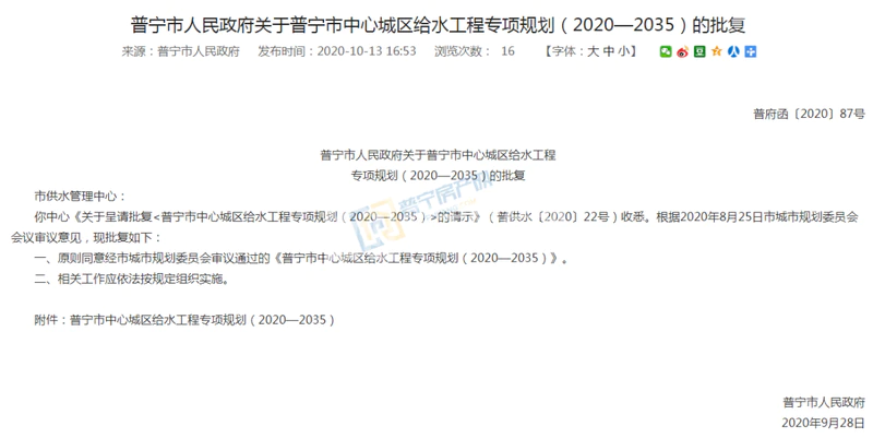 近日,普宁市人民政府发布了关于普宁市中心城区给水工程专项规划(2020—2035)的批复,具体内容如下: