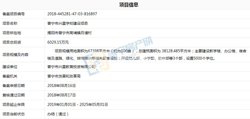 四、道路系统规划 主干路:规划道路红线宽32米。 次干路:规划道路红线宽20米。 支路:规划道路红线宽16米。 据小房君了解,本次规划的中小学地块为普宁市兴星学校建设项目,被列为《广东省2019年重点建设项目计划》。 备案资料显示,普宁市兴星学校建设项目位于普宁市高埔镇月塘村,由普宁市兴星教育投资有限公司建设,总投资6029.15万元,项目规模用地面积为67398平方米(约为100亩),总建筑面积为38128.485平方米;主要建设教学楼、办公楼、宿舍楼及道路、绿化、排污排水等相关配套设施;开设幼儿部、小学部、初中部等3个部,设置5000个学位。