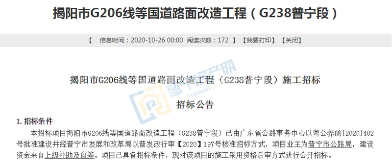 近日,揭阳市公共资源交易中心发布了揭阳市G206线等国道路面改造工程(G238普宁段)施工招标公告,该招标项目已由广东省公路事务中心以粤公养函[2020]402号批准建设并经普宁市发展和改革局以普发改行审【2020】197号核准招标方式,项目业主为普宁市公路局,建设资金来自上级补助及自筹。项目已具备招标条件,现对该项目的施工采用资格后审方式进行公开招标。