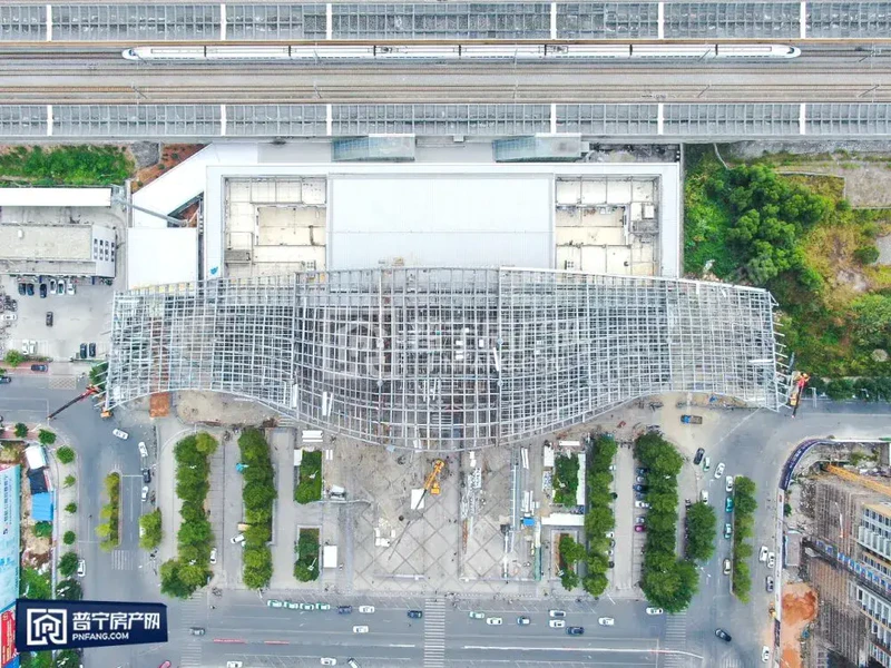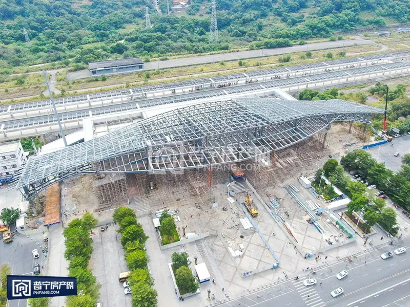 据悉,此次改扩建工程项目包括厦深铁路普宁站出站厅改扩建工程和厦深铁路普宁站广场雨棚改扩建工程两个子项目,主要建设内容包括车站外观改造、增设第二候车室和雨棚、连廊等设施。从现场图片可以看到,普宁站广场雨棚整体结构已现雏形,各项工作正在有条不紊的推进中。